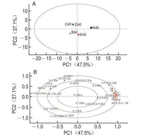 為了進一步了解紅曲霉強化發酵對黃豆醬揮發性風味物質的影響,對39種主要呈香風味化合物進行PCA,如圖1A所示。PC1和PC2累計貢獻率達到84.6%,可代表大部分風味物質的信息。