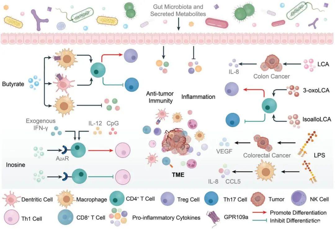 圖1 TME中免疫和炎癥反應主要由免疫細胞和細胞因子介導,微生物代謝產物起重要的調節作用