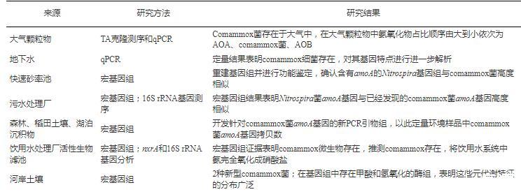 Comammox微生物確認(rèn)存在后,研究者使用comammox微生物amoA基因數(shù)據(jù)在公開(kāi)數(shù)據(jù)平臺(tái)進(jìn)行比對(duì),發(fā)現(xiàn)comammox微生物的amoA基因在土壤(稻田、平原、森林等)、淡水環(huán)境(濕地、河床、湖泊沉積物、蓄水層)均有分布。近來(lái),研究者對(duì)自然和人工環(huán)境中comammox菌的生境分布進(jìn)行了廣泛調(diào)研,在新的研究進(jìn)展中證實(shí)了相關(guān)規(guī)律。表1是不完全統(tǒng)計(jì)的目前報(bào)道的comammox微生物分布情況。現(xiàn)有的comammox菌的分布研究結(jié)果進(jìn)一步驗(yàn)證了comammox菌可在低氨氮濃度和微氧的環(huán)境中生存的特點(diǎn)。值得指出的是,雖然comammox微生物與AOA的基因存在諸多相似,至今未找到comammox微生物存在于海洋環(huán)境中的直接依據(jù)。