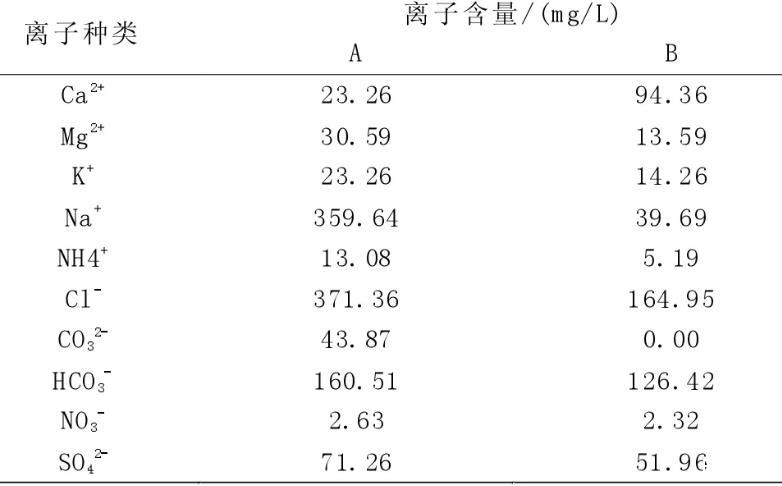 本文根據(jù)現(xiàn)場水質(zhì)取樣測試其離子含量,模擬配制兩種現(xiàn)場水質(zhì),選擇A、B兩種典型水質(zhì)條件,以蒸餾水(下文以O(shè)表示)為基準(zhǔn)實驗對象,研究細菌的生長曲線變化。其A和B液離子含量檢測結(jié)果如表1所示。