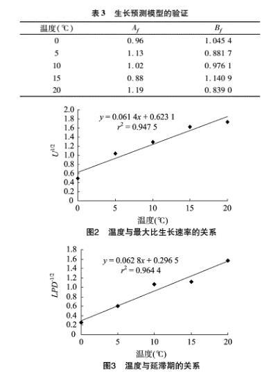 2.2.2一級模型的驗證用Af、Bf來驗證所建一級模型的準確性。Bf是衡量模型的重要參數,若其值為0.70~1.15,則該預測模型可以被接受,反之則說明預測模型是失敗的。由表3可知,模型的Af值均在1左右,Bf值均在0.70~1.15,說明該預測模型可以有效地預測0~20℃條件下草魚脊肉塊中熱殺索絲菌的生長。