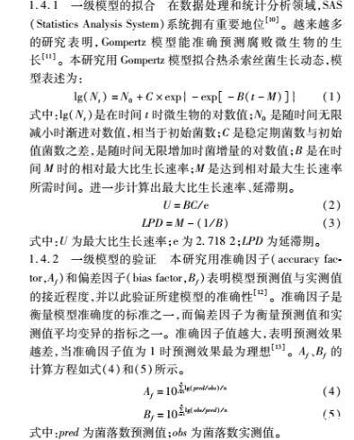 1.3.1一級模型的擬合在數據處理和統計分析領域,SAS(Statistics Analysis System)系統擁有重要地位。越來越多的研究表明,Gompertz模型能準確預測腐敗微生物的生長。本研究用Gompertz模型擬合熱殺索絲菌生長動態,模型表述為: