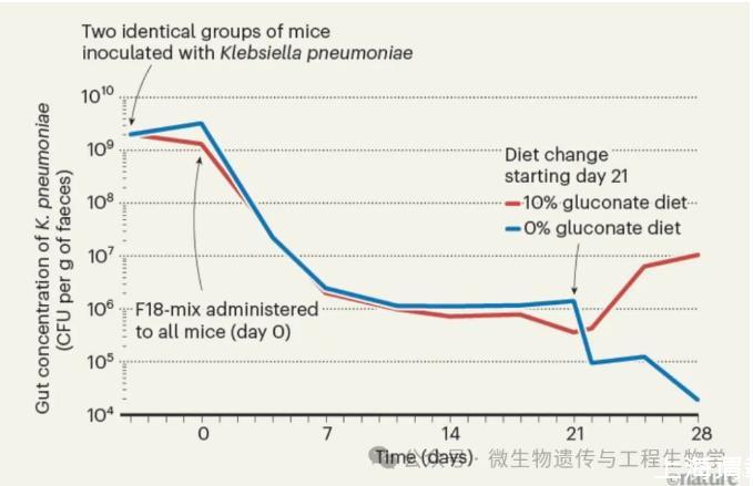 Furuichi等評估了小鼠糞便中的碳水化合物水平,在缺乏腸道微生物的小鼠中葡萄糖酸鹽濃度很高,但在含有F18-mix的小鼠中葡萄糖酸鹽濃度顯著降低,說明F18-mix具有降低葡萄糖酸鹽濃度的作用。除此之外,在食物中添加葡萄糖酸鹽可以逆轉F18-mix帶來的定植抗性(圖1)。