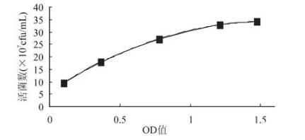 嗜熱鏈球菌在對數期的OD600值與直接計數法測得嗜熱鏈球菌的關系以OD600值為橫坐標,直接計數法測定的細胞數量為縱坐標,繪制XY散點圖,利用最小二乘法繪出兩者的回歸曲線,結果見圖1?;貧w方程為y=-11.489x2+35.968x+6.1745(R2=0.9998),回歸方程具有極顯著意義。