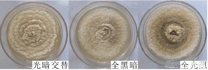 圖6柑桔砂皮病葉分離所得S2菌株在PDA培養基上不同光照條件培養10 d的菌落形態