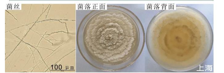 圖1柑桔砂皮病葉分離所得S2菌株在PDA培養基上的菌絲形態及菌落形態