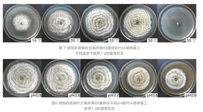 前人研究表明,不同地域條件對病原菌的生物學特性基本無顯著影響,而相同菌株在不同培養條件下的生物學特性存在差異。本研究分離鑒定獲得的柑桔砂皮病菌S2菌株,在不同培養條件下的生物學特性與前人研究結果基本一致。該菌株對甘油、麥芽糖和可溶性淀粉等碳源的利用效果較佳,菌絲擴展速度最快;對蛋白胨氮源的利用效果最好;在15~30℃均能生長,最適生長溫度為20~30℃,致死溫度為35℃;pH值5~9均能生長,最適pH值為5~7;光暗交替培養時,菌落才出現花瓣狀輪紋。