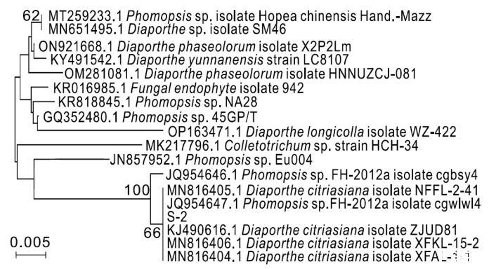 綜合菌株的培養性狀、形態特征和rDNA-ITS序列比對結果,將S2菌株鑒定為Diaporthecitriasiana。