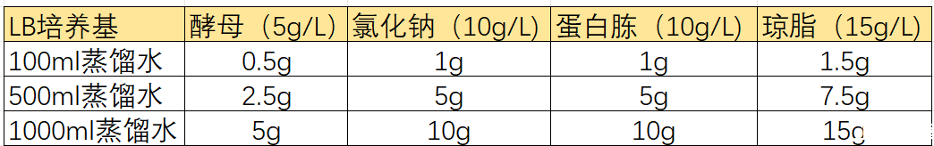 ①根據上表比例配置400mL的LB培養基,將封口膜封緊后放入高壓滅菌鍋中,121℃滅菌30min。②將培養基取出,放涼至50℃左右(用手摸錐形瓶不燙手)。③在超凈工作臺將放涼的培養基倒入平皿。④將平皿吹干,防止冷凝水聚集在平皿蓋上。