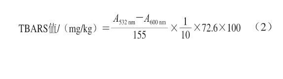 將魚肉研碎后,稱取10 g樣品放入錐形瓶中,再加入50 mL含0.1 g/100 mL乙二胺四乙酸的7.5 g/100 mL三氯乙酸溶液,置于加熱至70℃的振蕩器中振蕩30 min,取出靜置冷卻后過濾,取上清液5 mL加入0.02 mol/L TBA溶液,在90℃的水浴鍋中加熱45 min,取出靜置冷卻至室溫后,加入5 mL氯仿,充分混勻,靜置至溶液分層。分別在532 nm和600 nm波長處測定上清液吸光度。TBARS值按式(2)計算: