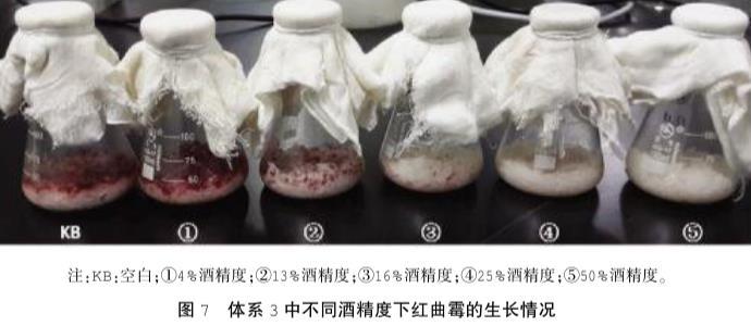 構(gòu)建體系3,研究酒精度對(duì)紅曲霉生長(zhǎng)的影響。如圖7所示,空白組(KB)和4%酒精度樣品組①的糯米上都能布滿菌絲,而隨著乙醇濃度的增加,糯米培養(yǎng)基上的紅色菌絲逐漸減少,表明酒精度的增加對(duì)紅曲霉的生長(zhǎng)有明顯的抑制作用。