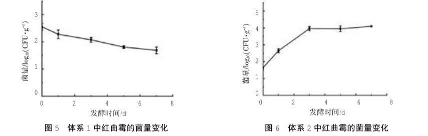 在紅曲米的制備及貯存過(guò)程中,曲米內(nèi)部和表面微生物分泌的代謝產(chǎn)物可能會(huì)對(duì)紅曲霉的生長(zhǎng)產(chǎn)生影響,為探究此影響,構(gòu)建了體系2。該體系在純菌發(fā)酵的基礎(chǔ)上加入了無(wú)菌紅曲處理液,如圖6所示。結(jié)果表明,體系2的生長(zhǎng)曲線與圖4中的純菌發(fā)酵體系類似,紅曲霉的菌量穩(wěn)步增加,可見(jiàn)曲米浸泡液中的物質(zhì)在發(fā)酵過(guò)程中對(duì)紅曲霉的生長(zhǎng)抑制并不顯著,可能由于微生物在生長(zhǎng)過(guò)程中會(huì)通過(guò)代謝作用來(lái)改變生長(zhǎng)環(huán)境,從而利于它自身的生長(zhǎng),而DEEG和qPCR的結(jié)果均顯示紅曲霉為紅曲米中的優(yōu)勢(shì)菌,曲米中積累的物質(zhì)難以對(duì)紅曲霉產(chǎn)生明顯的負(fù)面影響。