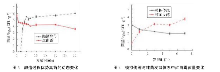 模擬傳統(tǒng)體系與傳統(tǒng)發(fā)酵體系相比,雖然在物質(zhì)傳遞、群體感應(yīng)、菌株拮抗、容器滲氧效果等方面可能有所不同,但結(jié)合圖3、圖4可以發(fā)現(xiàn),模擬傳統(tǒng)的紅曲霉菌量緩慢下降,與酒壇釀造的變化趨勢(shì)頗為相似,說(shuō)明模擬傳統(tǒng)體系中紅曲霉的變化趨勢(shì)重現(xiàn)性較好,體系構(gòu)建較為合理,便于后續(xù)研究。