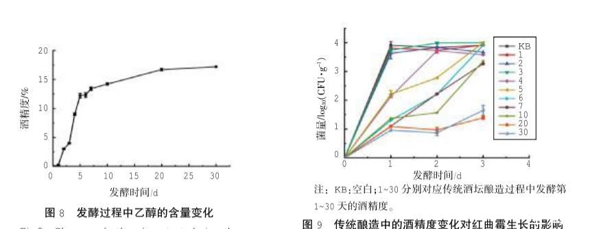 由圖9可知,單獨(dú)發(fā)酵第1天紅曲霉的菌量就出現(xiàn)明顯差異,分別聚集在3個(gè)位置:(1)KB和傳統(tǒng)發(fā)酵第1~3天的酒精度對(duì)應(yīng)的紅曲霉菌量最多,且在后續(xù)發(fā)酵中基本持平,說(shuō)明酒精度低于4%時(shí),對(duì)紅曲霉的生長(zhǎng)無(wú)影響;(2)傳統(tǒng)發(fā)酵第4~5天的酒精度(9%,12%)對(duì)應(yīng)的紅曲霉菌量居中,且在后續(xù)發(fā)酵中持續(xù)上升至與KB相當(dāng),有研究表明紅曲霉可以耐受10%左右的乙醇,說(shuō)明此時(shí)的酒精度已臨近紅曲霉的耐受范圍,紅曲霉的生長(zhǎng)開(kāi)始受到抑制;(3)傳統(tǒng)發(fā)酵第6~30天的酒精度,這些酒精度下對(duì)應(yīng)的紅曲霉菌量最少,且在后續(xù)發(fā)酵中,第6~10天的酒精度下紅曲霉菌量迅速增加,而發(fā)酵第20~30天的酒精度下紅曲霉的菌量則增加緩慢,抑制作用更明顯,該結(jié)果與DGGE圖譜的菌量變化相一致,即紅曲霉的條帶在發(fā)酵第20天明顯變淡。