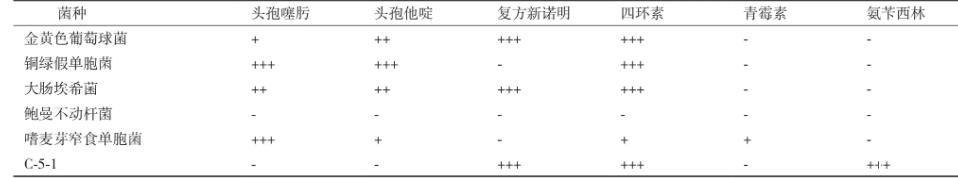 表3五種指示菌與側孢短芽孢桿菌C-5-1的藥敏分析