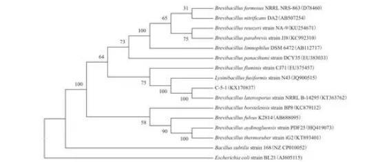 以菌株C-5-1的基因組DNA為模板,PCR擴增和測序獲得了16S rRNA基因的部分片段(1 438 bp),NCBI GenBank登錄號為KX170837。選擇同源性較近的菌株與C-5-1構建系統發育進化樹,結果顯示(圖2)該菌株與側孢短芽孢桿菌的同源關系最近。結合形態學和生理生化鑒定結果,確定為側孢短芽孢桿菌,該菌株被命名為C-5-1。