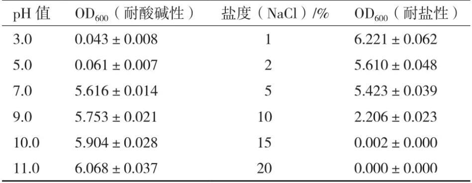 分別測定細菌在不同酸堿度和鹽度的生長特性,從而為該菌株的進一步培養和發酵利用提供依據。結果(表4)顯示,側孢短芽孢桿菌C-5-1在低pH環境中耐受性有限,在pH≤5.0時幾乎沒有生長,但在pH≥7.0時生長良好,并且隨著pH值的升高,菌體量也一直在增加,這說明該菌株耐堿不耐酸。菌株C-5-1在NaCl鹽度≤5%(相當于50 g/L)時正常生長,但隨著鹽度的增加該菌株的生長受到了一定的抑制,當鹽度≥15%時,其生長受到了完全抑制甚至死亡。這是因為不同鹽度能形成不同滲透壓環境,造成細胞不同程度的脫水,從而降低生長速率,甚至失活。