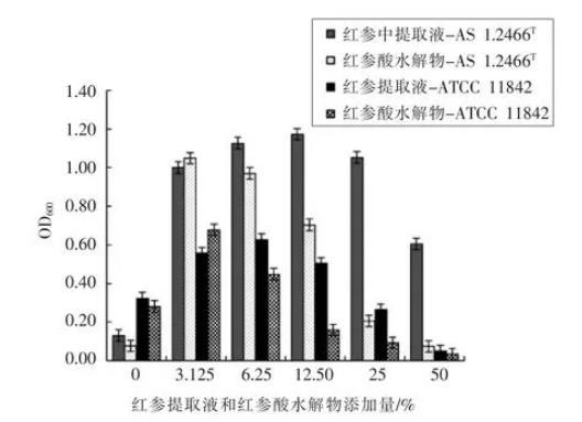圖5紅參提取液和紅參酸水解物對鼠李糖乳桿菌AS 1.2466T和保加利亞乳桿菌ATCC 11842體外生長的影響