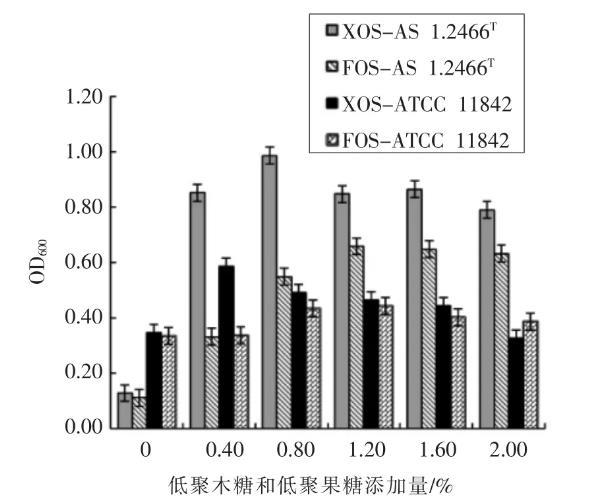 圖4低聚木糖和低聚果糖對鼠李糖乳桿菌AS 1.2466T和保加利亞乳桿菌ATCC 11842體外生長的影響