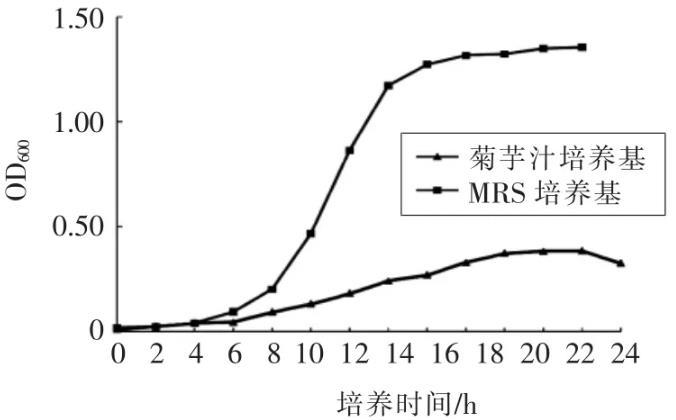 由圖2可見,保加利亞乳桿菌ATCC 11842在MRS培養基中16 h時進入對數生長末期,此時OD600值為1.272,對應活菌數為3.25×108CFU/mL。在菊芋汁基礎培養基中18 h達到對數生長末期,此時OD600值為0.331,對應活菌數為1.48×107CFU/mL。