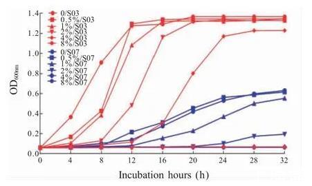 圖4鹽度對S03株和S07株生長影響的生長曲線