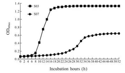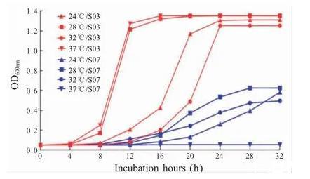 圖2溫度對S03株和S07株生長影響的生長曲線