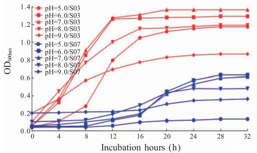 圖3 pH對S03株和S07株生長影響的生長曲線
