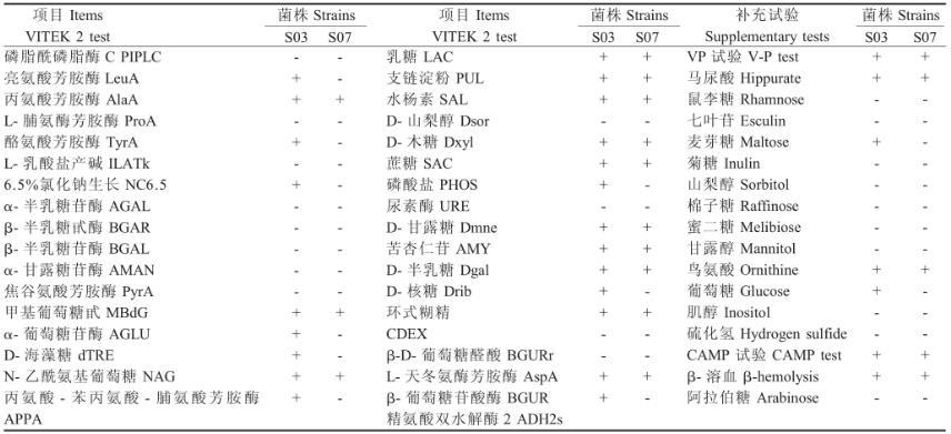 2.1兩株菌的生理生化特性的測定VITEK 2 COMPACT 30全自動細菌分析系統檢測和補充生化試驗結果見表1,結果表明S03株和S07株在生理生化特性上表現出明顯差異,S07株相對于S03株缺乏利用多種糖類、代謝酶的能力。