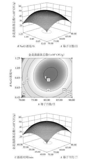 圖4各因素交互作用對金花菌菌落總數影響的響應面和等高線圖