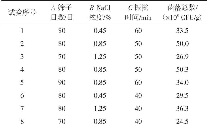 以篩子目數、無菌稀釋液濃度、振搖時間為自變量,以金花菌菌落總數為響應值,試驗設計與結果見表2。零點為區域的中心點,零點試驗重復5次,用以估計試驗誤差。