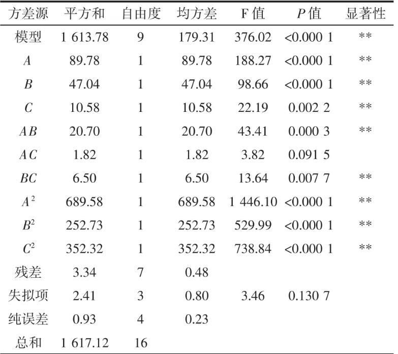 采用Design-Expert.V8.0.6對試驗數據進行多元線性擬合,得到以金花菌菌落總數為響應值的二次多項回歸模型方程:Y=50.42-046A+0.54B+1.78C+0.65AB-0.075AC+2.63BC-8.94A2-10.88B2-14.41C2。對模型方程進行顯著性檢驗,方差分析結果見表3。