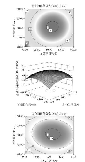 表3中F值的大小可以判斷各因素對金花菌菌落總數影響的強弱。各個因素對金花菌菌落總數影響的程度大小的次序為篩子目數>NaCl濃度>振搖時間,數學模型的結果表明A、B、C、AB、BC、A2、B2及C2差異性達到極顯著水平(P<0.01),表明各考察因素對金花菌菌落總數的影響具有交互作用,而不是簡單的線性關系。可用該回歸方程代替試驗真實點對試驗結果進行分析和預測。其相關系數R2=0.997 9,表明試驗所選擇的3個變量對響應值的影響已達99.79%,表示該模型條件能夠很好地反映實際值。其他影響因素對菌落總數的影響可忽略不計。響應面試驗得到的最優處理條件為:篩子目數79.74目、NaCl濃度0.86%、振蕩時間50.49 min,模型預測的最佳菌落數為50.49×105CFU/g。