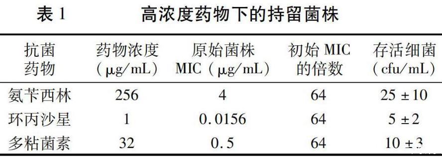 在高藥物濃度的培養條件(氨芐西林256μg/mL,環丙沙星1μg/mL,多粘菌素32μg/mL)下,持續作用6 d,依然能夠檢測到存活的細菌。按照接種量104 cfu/mL數量級計算,存活率在0.1%左右(表1)。此試驗結果表明,即使在有限的空間內,只要初始接種量達到一定數量,高于致死濃度的抗菌藥物并不能完全殺死細菌,總會有一小部分細菌存活下來。
