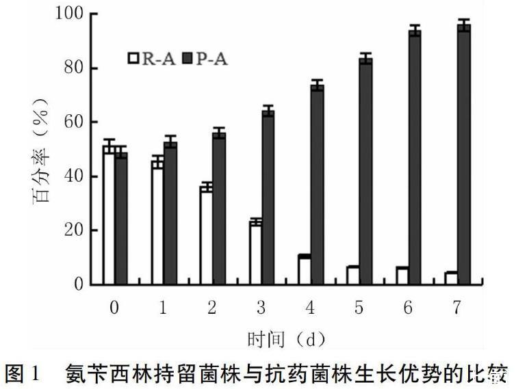 氨芐西林處理的P-A和R-A菌株MIC范圍無相互交叉,將二者等比例混合接種培養,根據穩定的MIC范圍統計其比例變化。如圖1所示,混合培養后,持留菌株P-A所占比例逐漸升高,到第4 d增至70%以上,至第7 d抗藥菌株R-A比例低于5%,菌株P-A數量占絕對優勢。此結果表明,在沒有藥物的培養條件下,P-A具有更強的生長優勢。隨機挑選氨芐西林作用下存活的其它持留菌株和抗藥菌株,用同樣的方法對比其生長優勢,也有類似的結果(數據略)。另外兩種藥物環丙沙星和多粘菌素的持留菌株和抗藥菌株,生長優勢的比較也存在類似結果(數據略),最終都能體現出持留菌株具有更強的生長優勢。本研究中共檢測8組菌株的對比,未檢測到例外情況。