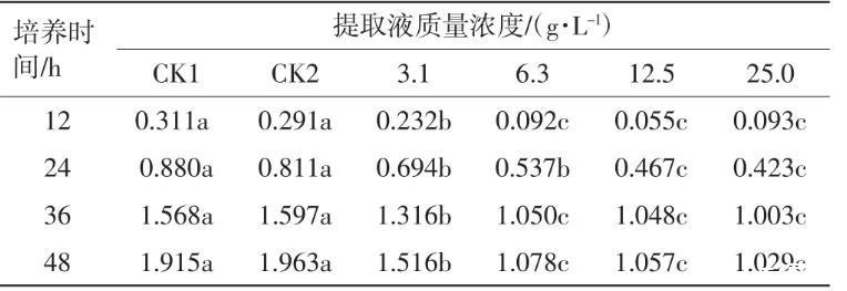 將苦瓜葉片提取液設置4種質(zhì)量濃度(3.1、6.3、12.5、25.0g/L),同時用清水(CK1)和乙醇(CK2)作為對照,共設6個處理,每個處理重復3次。分別在各處理組中加入制備好的液態(tài)培養(yǎng)基1份,同時接種農(nóng)桿菌,將各處理菌液置于28℃、200r/min環(huán)境下培養(yǎng)。對菌液每12h進行1次吸光度值D(λ)600的測量。因苦瓜葉片乙醇提取液本身為綠色,為消除提取液自身顏色對吸光度的影響,另配制每個濃度下未接種農(nóng)桿菌的培養(yǎng)基,測量吸光度值。最終測量值為含菌培養(yǎng)液的吸光度值減去不含菌培養(yǎng)液的吸光度值。