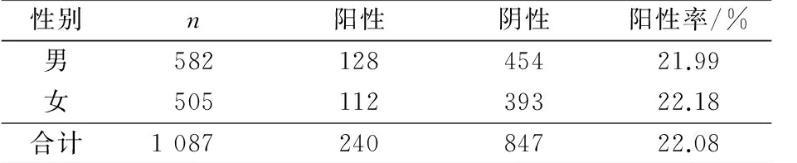 1 087例肺炎患兒的咽拭子標(biāo)本中MP培養(yǎng)陽(yáng)性240例(240株),陽(yáng)性率為22.08%。其中男性患兒MP陽(yáng)性率為21.99%,女性患兒MP陽(yáng)性率為22.18%,男女間比較差異無(wú)統(tǒng)計(jì)學(xué)意義(P>0.05)。見(jiàn)表1。