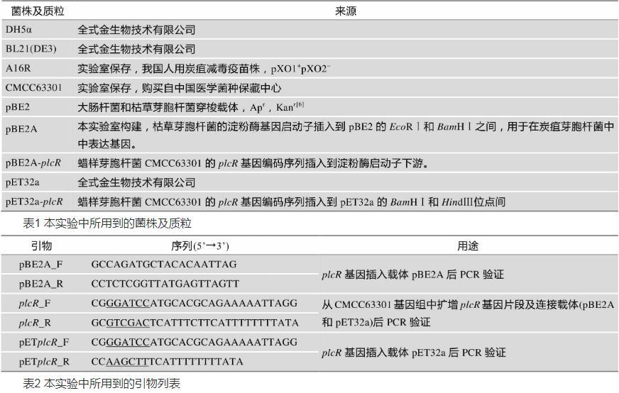 1.2.1.2 PlcR表達(dá)、純化及抗PlcR多克隆抗體制備為了將來(lái)檢測(cè)基因是否在炭疽芽胞桿菌中中表達(dá),我們制備了抗PlcR多克隆抗體,具體方法是:以CMCC63301基因組為模板,用引物pET_F/R(表2)擴(kuò)增片段,用HⅠ和dⅢ酶切連接到pET32a載體上,將構(gòu)建好的質(zhì)粒化學(xué)轉(zhuǎn)化到DH5α中,測(cè)序正確后,轉(zhuǎn)化到BL21感受態(tài)中,構(gòu)建pET32a-/BL21,同時(shí)用相同的方法構(gòu)建pET32a/BL21。