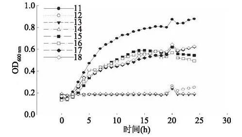 注:11:對(duì)照組乙型副傷寒沙門氏菌的生長(zhǎng)曲線;12:WBL-45濃度2處理的乙型副傷寒沙門氏菌(WBL-45終濃度為30 mL/100 mL)的生長(zhǎng)曲線(WBL45-30 mL/100 mL);13:VHI41-30 mL/100 mL;14:LS-30 mL/100 mL;15:CK-30 mL/100 mL;16:用濃度1的WBL-45處理的乙型副傷寒沙門氏菌的生長(zhǎng)曲線(WBL45-IC50);17:VHI41-IC50;18:LS-IC50。