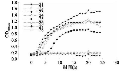 注:21:對(duì)照組金黃色葡萄球菌的生長(zhǎng)曲線;22:WBL-45濃度2處理的金黃色葡萄球菌(WBL-45終濃度為30 mL/100 mL)的生長(zhǎng)曲線(WBL45-30 mL/100 mL);23:VHI41-30 mL/100 mL;24:LS-30 mL/100 mL;25:CK-30 mL/100 mL;26:用濃度1的WBL-45處理的金黃色葡萄球菌的生長(zhǎng)曲線(WBL45-IC50);27:VHI41-IC50;28:LS-IC50。