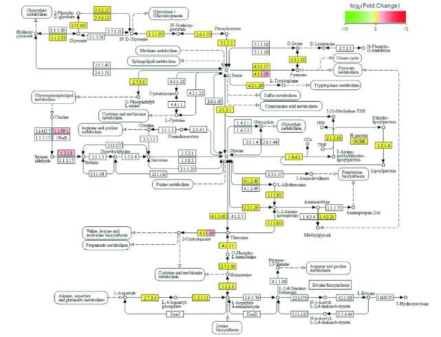 KEGG分析差異基因表達顯示,229個差異基因中有69個基因(47個基因上調,22個基因下調)富集于68條通路,且大部分為代謝相關通路,主要以上調基因的富集通路為主,包括甘氨酸、絲氨酸和蘇氨酸代謝等氨基酸代謝(圖3),果糖和甘露糖等糖類代謝,甲烷、硫、核黃素等代謝,嘌呤、嘧啶代謝,卟啉與葉綠素、抗壞血酸和醛酸代謝,丙酸、丁酸代謝,以及一些化合物的生物合成與降解。