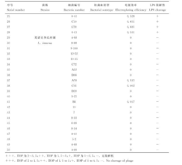 利用實(shí)驗(yàn)室所保存的產(chǎn)單核細(xì)胞李氏桿菌、威爾斯李氏桿菌和英諾克李氏桿菌對LP8噬菌體進(jìn)行宿主譜鑒定,結(jié)果顯示LP8噬菌體對18株LM都具有裂解性,對5株威爾斯李氏桿菌(C10、9-2、4-40、C59、4-43)具有裂解性,對22株英諾克李氏桿菌均無裂解性(表1)。