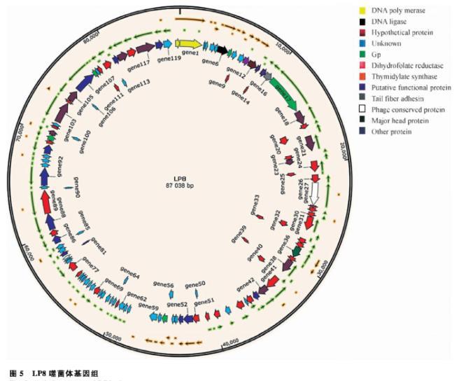 經(jīng)測序,噬菌體LP8的基因組為87 038 bp,共有120個(gè)編碼基因,編碼基因的累加長度為76 326 bp、編碼基因的平均長度為636 bp、編碼區(qū)域長度占基因組的比例為87.69%。通過SnapGene軟件對全基因組進(jìn)行繪圖,分析其基因的大小和分布情況。通過COG、KEGG、GO對LP8的基因進(jìn)行注釋,發(fā)現(xiàn)有6個(gè)編碼基因參與原噬菌體合成;有20個(gè)編碼基因參與噬菌體有關(guān)的生物過程;11個(gè)編碼基因參與分子功能,如結(jié)合或催化;8個(gè)編碼基因參與噬菌體的合成,具體生物學(xué)通路最多的為嘌呤代謝和嘧啶代謝(圖5)。