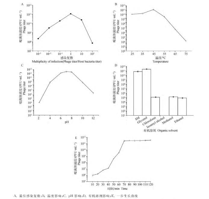 對LP8設(shè)置不同的感染比例,測定出LP8的MOI為1(圖3A);設(shè)置25、35、45、55、65、75℃溫度梯度,確定LP8的最適溫度為45℃(圖3B);設(shè)置pH為2、4、6、7、8、10、12梯度,確定LP8的最適pH為7(圖3C);采用的6種有機(jī)溶劑中,氯仿和異戊醇對LP8影響最大,可造成LP8全部失活,丙三醇和SM空白對照組沒有影響,甲醇和乙醇會(huì)導(dǎo)致噬菌體部分失活(圖3D);繪制一步生長曲線,確定LP8潛伏期為23 min,對數(shù)期為23~80 min,80 min以后達(dá)到平臺(tái)期,噬菌體效價(jià)最大可達(dá)到3.4×10PFU·mL(圖3E)。