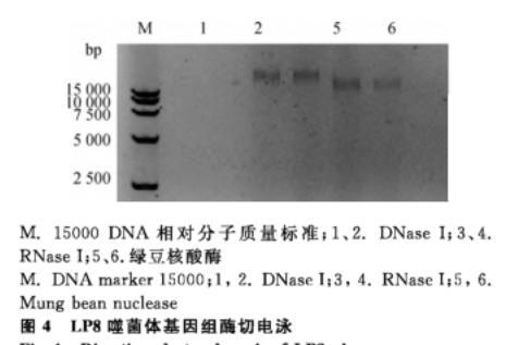 電泳條帶顯示,噬菌體LP8基因組在1、2號DNA酶泳道未出現(xiàn)條帶,在3、4號RNA泳道和5、6號綠豆核酸酶泳道都出現(xiàn)了條帶,根據(jù)條帶結(jié)果得出噬菌體基因組為雙鏈DNA(圖4)。