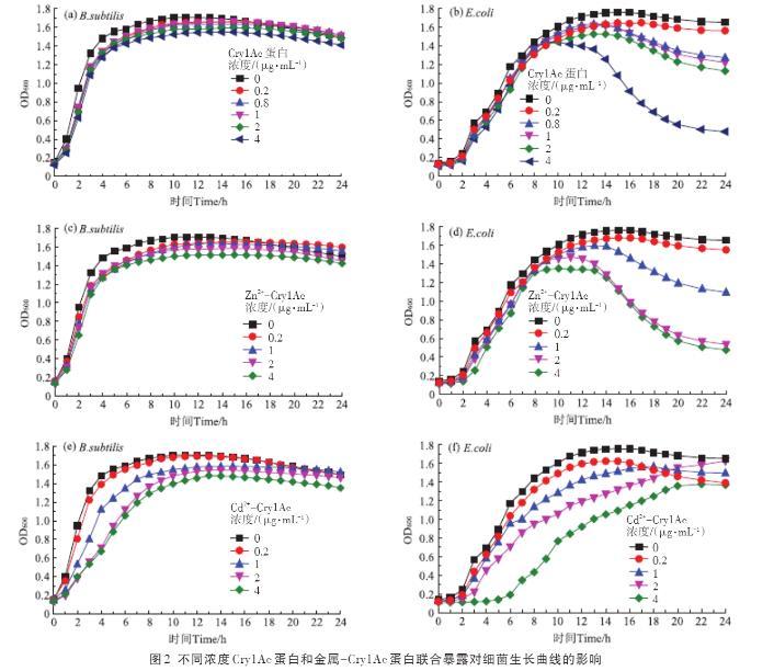 圖2為Cry1Ac蛋白及其與Zn2+、Cd2+聯合暴露條件下的細菌生長曲線。