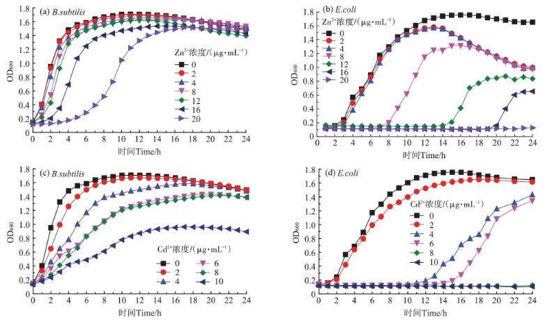 圖1不同濃度Zn2+、Cd2+對細菌生長曲線的影響