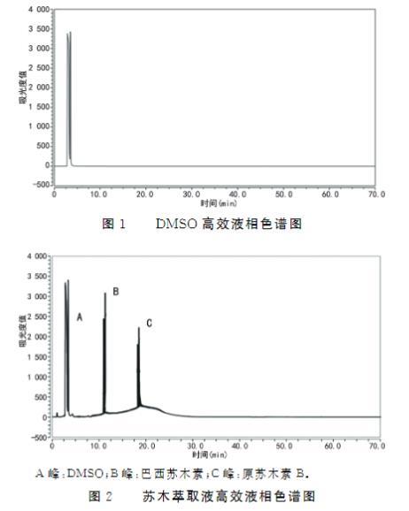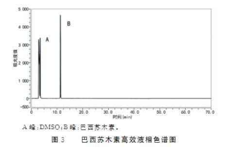 DMSO的高效液相圖譜見(jiàn)圖1,蘇木萃取液的高效液相圖譜見(jiàn)圖2,巴西蘇木素的高效液相圖譜見(jiàn)圖3,說(shuō)明蘇木萃取液中產(chǎn)生抑菌作用的組分為巴西蘇木素。