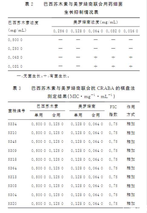 美羅培南對(duì)CRABA的MIC為0.128 mg/mL,F(xiàn)IC指數(shù)為0.75,為相加作用,見(jiàn)表2、3。