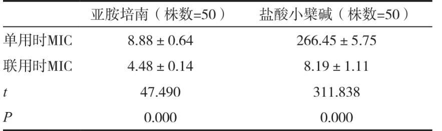 單用亞胺培南時,MIC值顯著大于與鹽酸小檗堿聯(lián)用(P<0.05);單用鹽酸小檗堿時,MIC值顯著大于與亞胺培南聯(lián)用(P<0.05),見表3。