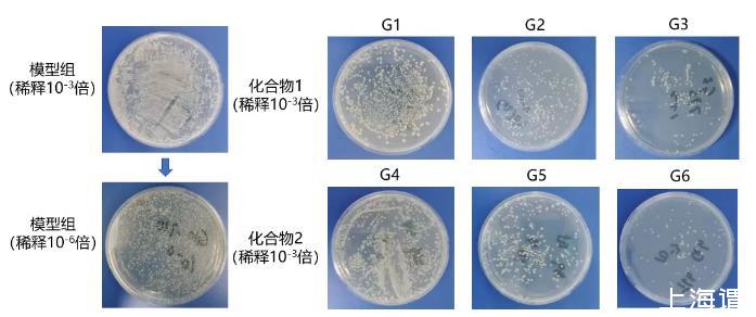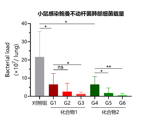 與對照組相比,化合物1和化合物2均能顯著降低鮑曼不動桿菌感染后小鼠肺部的細(xì)菌載量(P<0.05),且這種治療效果具有劑量依賴效應(yīng)。在不同劑量的化合物1和化合物2中,高劑量化合物2(G6)的治療效果最好(P<0.01)。